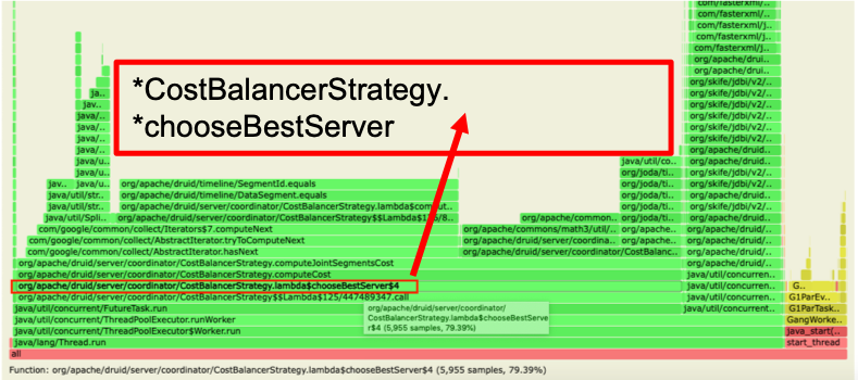 通过火焰图对 Coordinator 进行 Profiling 最终定位了问题,如下图所示,将最耗时部分放大出来,是负载均衡策略对每个 Segment 要选择一个最佳的服务器。阅读源码可知其过程为,加载 Segment X,需要计算它和服务器的每个 Segment Y 的代价 Cost(X,Y),其和为服务器和 Segment X 的代价。假设集群有 N 个 Segment,M 个 Historical 节点,则一个节点宕机,有 N/M 个 Segment 需要加载,每个 Segment 都和剩余的 N 个节点计算一次代价,调度耗时和 N 成平方关系。