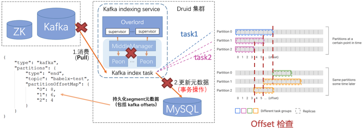和 Tranquility 的 Push 模式不同,KIS 采取 Pull 模式,索引任务从 Kafka 拉取消息,构建 Segment。关键点在于最后持久化 Segment 的时候,KIS 任务有一个数据结构记录了上一次持久化的 Offset 位置,如图例左下角所示,记录了每个 Kafka Partition 消费的 Offset。在持久化时会先检查 Segment 的开始 Offset 和元信息是否一致。如果不一致,则会放弃本次持久化,如果一致,则触发提交逻辑。提交中,会同时记录 Segment 元信息和 Kafka Offset,该提交过程为原子化操作,要么都成功,要么都失败。
