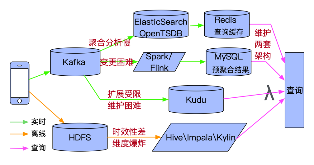 无论选用哪种实时或离线方案的组合,都会采用 Lambda 架构,用离线数据校准实时数据。这意味着从摄入、处理、查询都需要维护两套架构,新增一个维度,离线和实时均需对应修改,维护困难。