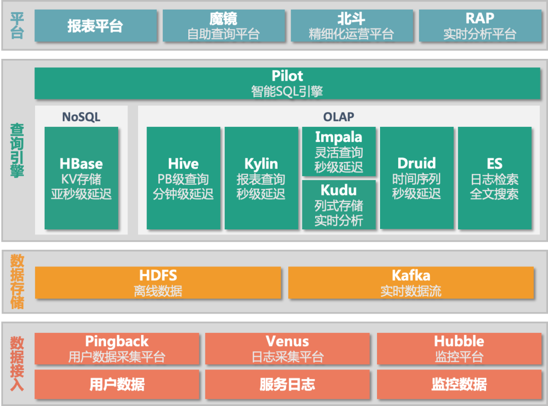 爱奇艺大数据 OLAP 服务在2015年前主要以离线分析为主,主要基于 Hive+MySQL、HBase 等。2016年起引入 Kylin 和 Impala 分别支持固定报表和 Ad-hoc 查询。2018年以来引入 Kudu 和 Druid 支持实时分析需求。