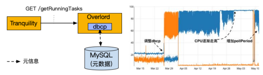 Overlord 性能慢,我们发现升级到0.14后 Overlord API 性能较差,导致的后果是索引任务概率性因调用 API 超时而失败。通过 Jstack 分析,看到大部分的 HTTP 线程均为阻塞态,结合代码分析,定位到 API 慢的原因,如左图所示,Tranquility 会定期调用 Overlord API,获取所有 RunningTasks,Overlord 内部维护了和 MySQL 的连接池,该连接池默认值为8,该默认值值过小,阻塞了 API 处理。解决方法是增大 dbcp 连接池大小。