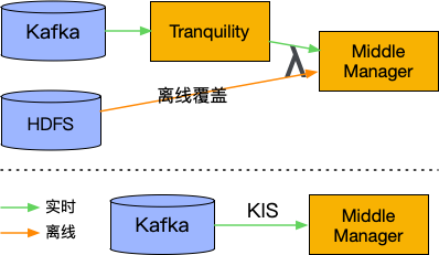 刚使用 Druid 时,当时主力模式是 Tranquility。Tranquility 本质上仍然是经典的 Lambda 架构,实时数据通过 Tranquility 摄入,离线数据通过 HDFS 索引覆盖。通过离线覆盖的方式解决消息延迟的问题,缺点是维护两套框架。对于节点失败的问题,Tranquility 的解决方案是链路冗余,即同时在两个索引节点各起一份索引任务,任一节点失败仍有一份能够成功,缺点是浪费了一倍的索引资源。自0.14版本起,Druid 官方建议使用KIS模式索引数据,它提供了 Exactly Once 语义,能够很好地实现流批一体。