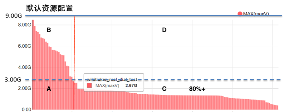 在最初,集群所有的索引任务都是统一配置,但实际使用过程中,大部分的索引任务根本达不到百万/分钟的消息量,造成了资源大量浪费。如下图所示,我们按照索引任务的内存使用量从高到低排序,9 GB 为默认配置,80%的任务利用率低于1/3,即 3 GB。我们以 3 GB 绘制一条横线,以内存使用最接近的任务绘制一条竖线,定义 A 为实际使用的内存,B 为第二象限空白部分,C 为第四象限空白部分,D 为第一象限空白部分,则浪费的资源 = ( B+C+D ) 的面积。