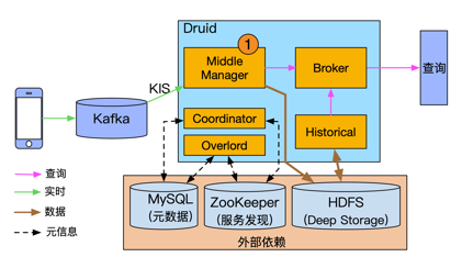 MiddleManager:索引节点,负责实时处理消息,将其转成列式存储,并通过 Rollup 精简数据量;索引节点定期将内存中数据持久化为不可修改的文件 ( Segment ),保存至 HDFS 保证数据不会丢失;