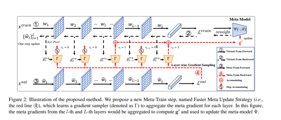 基于meta-learning的方法在有噪声标注的图像分类中取得了显著的效果。这类方法往往需要大量的计算资源,而计算瓶颈在于meta-gradient的计算上。本文提出了一种高效的meta-learning更新方式:Faster Meta Update Strategy (FaMUS),加快了meta-learning的训练速度 (减少2/3的训练时间),并提升了模型的性能。首先,我们发现meta-gradient的计算可以转换成一个逐层计算并累计的形式; 并且,meta-learning的更新只需少量层数在meta-gradient就可以完成。基于此,我们设计了一个layer-wise gradient sampler 加在网络的每一层上。根据sampler的输出,模型可以在训练过程中自适应地判断是否计算并收集该层网络的梯度。越少层的meta-gradient需要计算,网络更新时所需的计算资源越少,从而提升模型的计算效率。