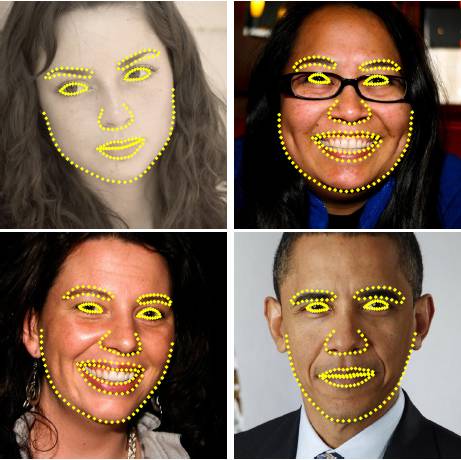 形状(shape):形状就是人脸上的有特征的位置,如下图所示,每张图中所有黄点构成的图形就是该人脸的形状;