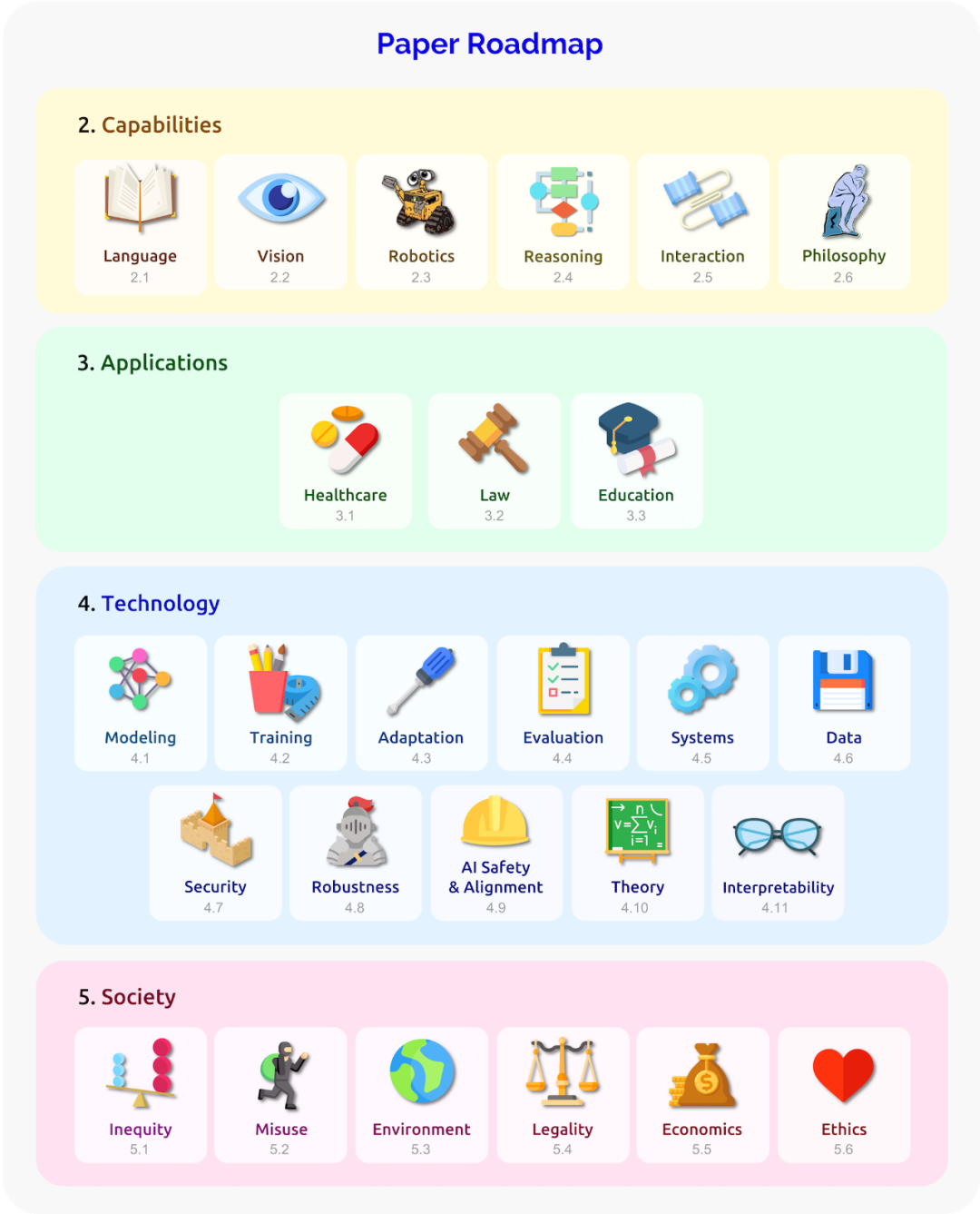 目前,基础模型的研究主要局限于计算机科学和人工智能领域,而基础模型的影响和其所支撑的应用主要集中在科技产业。更进一步,基础模型展现出了明显的潜力,其可以在科技产业以外的许多领域改变和拓展人工智能的影响范围,这也意味着对于人类生活的普遍影响。尽管有许多应用和领域需要考虑,我们选择了医疗保健、法律和教育这三个领域,因为它们代表了社会的基本支柱。为了在这些领域做出重大贡献,基础模型需要特定的能力