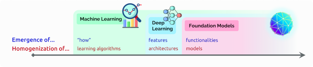 图1 人工智能的故事一直是不断涌现或是不断同质化。随着机器学习的引入,任务从例子中学习如何执行(自动推断);通过深度学习,涌现了用于预测的高级特征;有了基础模型,甚至涌现了上下文学习等高级功能。与此同时,机器学习使学习算法同质化(例如,逻辑回归),深度学习使模型架构同质化(例如,卷积神经网络),基础模型使模型本身同质化(例如,GPT-3)