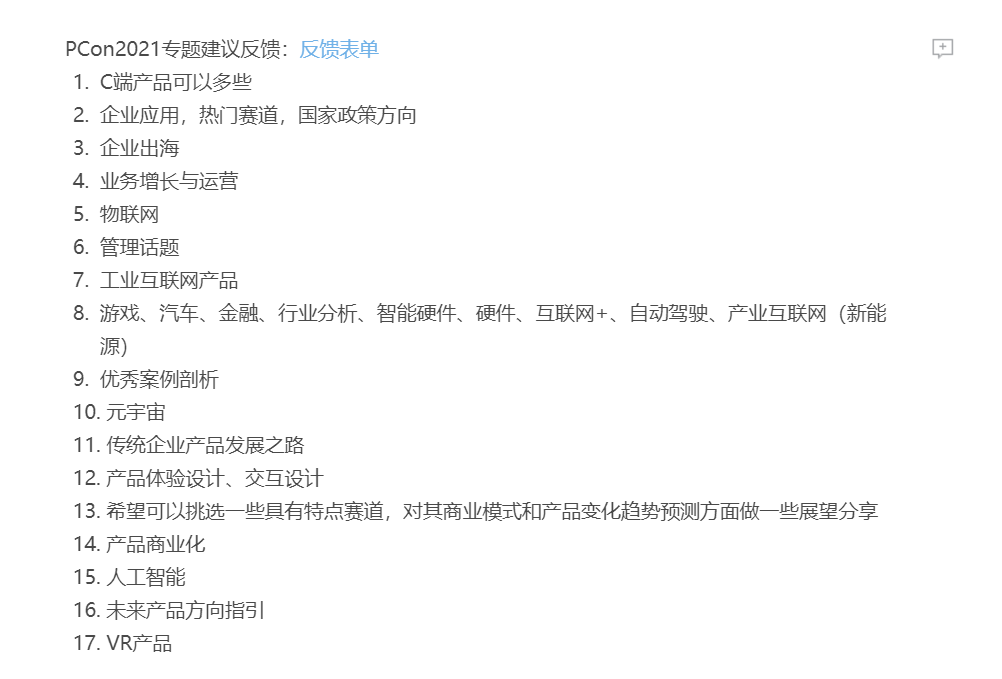 除此之外,在首届 PCon 落地之后,我们收到了近 200 条反馈建议,大约分为以下几类。