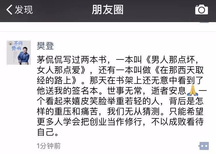 茅侃侃写过两本书,一本叫《男人那点坏,女人那点爱》,还有一本叫做《在那西天取经的路上》。那天在书架上还无意中看到了他送我的签名本。世事无常,逝者安息(合十)一个看起来嬉皮笑脸举重若轻的人,背后是怎样的重压和痛苦,我们无从猜测。只能希望更多人学会把创业当作修行,不以成败看待自己。