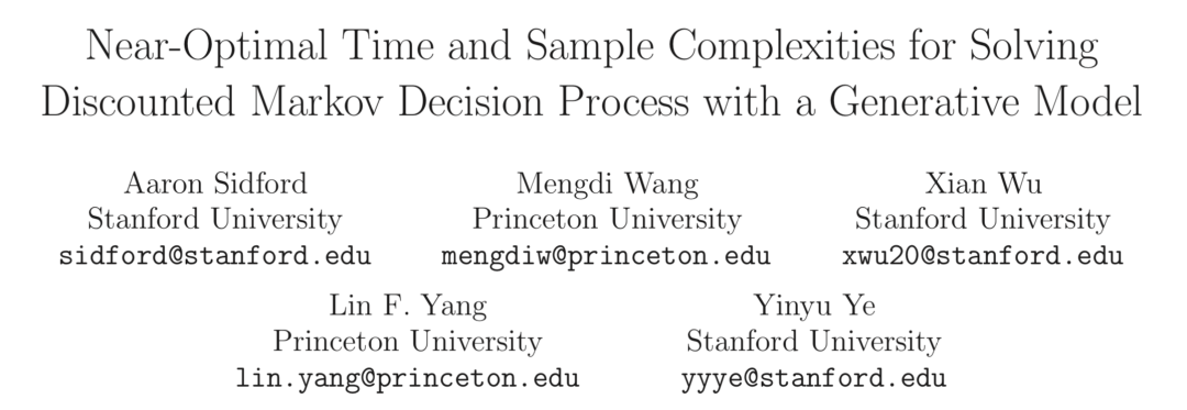 这些探索性的研究更加深了王梦迪对随机优化理论与机器学习结合的兴趣。接着,她又与斯坦福大学的叶荫宇(冯诺伊曼理论奖唯一华人获得者)等人合作,研究马尔可夫决策链(MDP)的理论复杂度与最优算法。