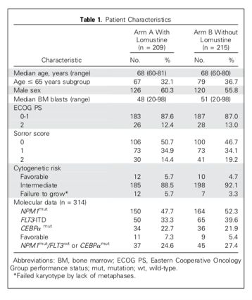 2008年2月至2011年12月,该研究共招募了459例患者,最终227例和232例患者被随机分至A组(联合洛莫司汀)和B组(不联合洛莫司汀),两组中分别有209例和215例纳入分析。经评估两组患者的临床特征大致平衡(Table 1),中位年龄均为68岁,多数患者的ECOG PS和Sorror评分较低,90%的患者为细胞遗传学中危组。286例患者筛查了FLT3、NPM1和CEBPA的突变状态。