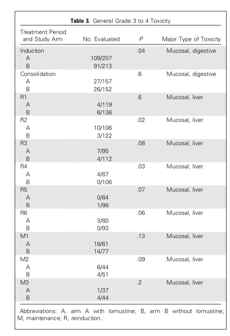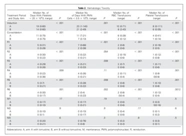 在血液学毒性评估上,A组在诱导和巩固治疗期间的毒性显著高于B组(Table 2)。而在诱导治疗期间的总体毒性评估上,A组亦显著高于B组(53% v 40.9%; Table 3) 。值得一提的是,两组由毒性导致的2年累计死亡率并无显著差异(12.4% vs 7.4%)。