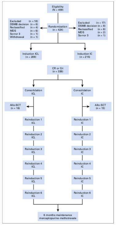 自2008年2月至2011年12月,该研究纳入了来自法国32个中心的459例年龄60-65岁老年AML患者(除急性早幼粒细胞白血病和孤立性粒细胞肉瘤之外),入组患者被随机分配至联合或不联合洛莫司汀的诱导化疗和巩固治疗组。诱导治疗方案为伊达比星8 mg/m2/d IV d1-5,阿糖胞苷100 mg/m2/d IV d1-7,联合(ICL)或不联合(IC)洛莫司汀200mg/m2 po d1。1个诱导化疗疗程后未获CR或CRi的患者不再接受二次诱导化疗,获得CR或CRi的患者则继续接受巩固治疗,方案为伊达比星8 mg/m2/d IV d1-3,阿糖胞苷50mg/m2 q12h IV d1-5,联合(ICL)或不联合(IC)洛莫司汀80mg po d1,1个巩固疗程后继续进行6个疗程的减量再诱导治疗,方案为:伊达比星8 mg/m2/d IV d1,阿糖胞苷50mg/m2 q12h IV d1-5,联合或不联合洛莫司汀40mg po d1。随后是包括6-巯嘌呤和甲氨蝶呤在内的6个月维持治疗。研究设计的具体流程见Figure1。本研究的主要目标为2年OS,次要目标为反应率,2年无事件生存率(EFS)和安全性。同时,本研究亦评估了累计复发率(CIR)和药物毒性所致的死亡率。