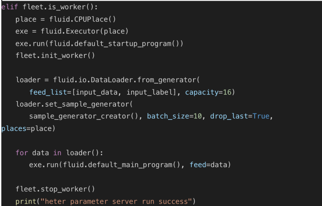 为了能让广大用户快速上手异构参数服务器训练架构,飞桨在操作方面做的也比较简单,不仅配有成熟的脚本么,并且仅需要补充简单的几行代码,就可以将传统参数服务器训练架构修改为异构参数服务器架构。