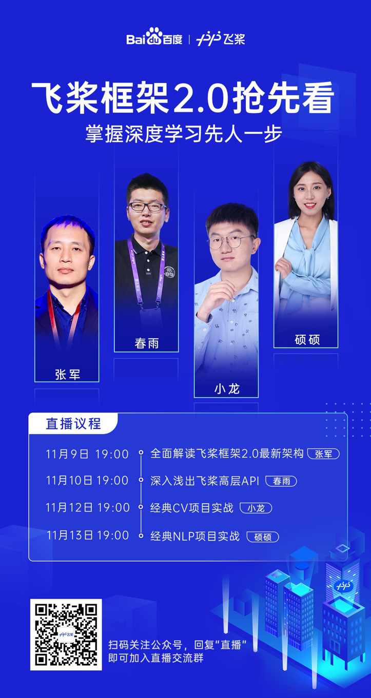 由百度深度学习工程师精心打造的 4 节系列直播课,11 月 9 日、10 日、12 日、13 日每天晚上 19 点