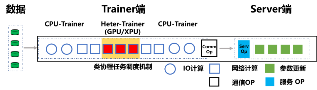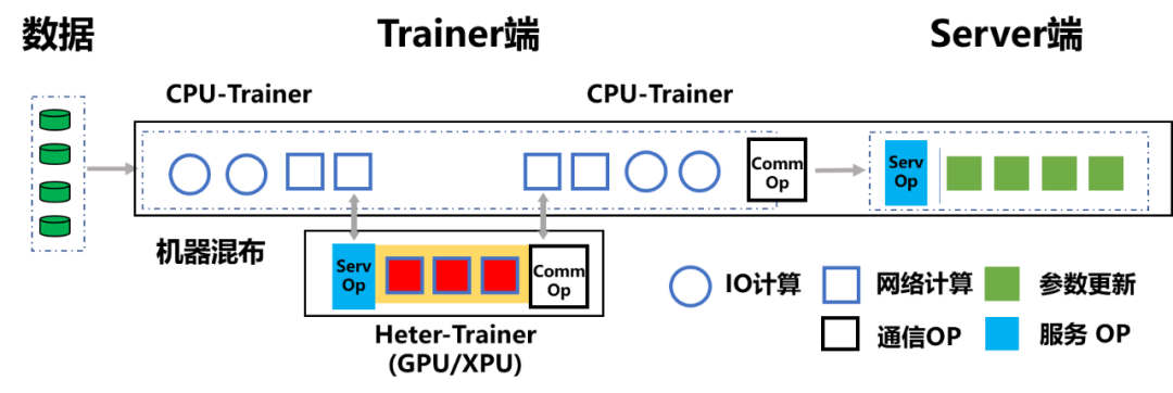 ,原先那样粗粒度的任务分工显然不再适用,只有让不同硬件参加到训练任务中,并在自己最擅长的领域工作,才能各显神通。因此飞桨的研发人员在传统的 CPU-Trainer 之外,又部署了一类 Heter-Trainer,并在 Heter-Trainer 上配置有 Service。这样 CPU-Trainer 便将 Heter-Trainer 视为特殊的 Server,从而对 Heter-Trainer 的异构算力不敏感,使 Heter-Trainer 可以混部各类不同型号芯片(例如 GPU 或 XPU 等)。