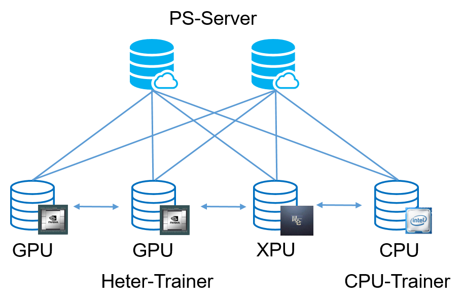 飞桨的异构参数服务器架构不仅可以支持 CPU 机器、GPU 机器和 XPU 机器的混合模式,而且支持全部 CPU-Trainer 或 GPU-Trainer 的那样的传统参数服务器的硬件组合,甚至在 GPU 单类型机器的集群内采用 Heter 模式,可以达到训练提速的效果。