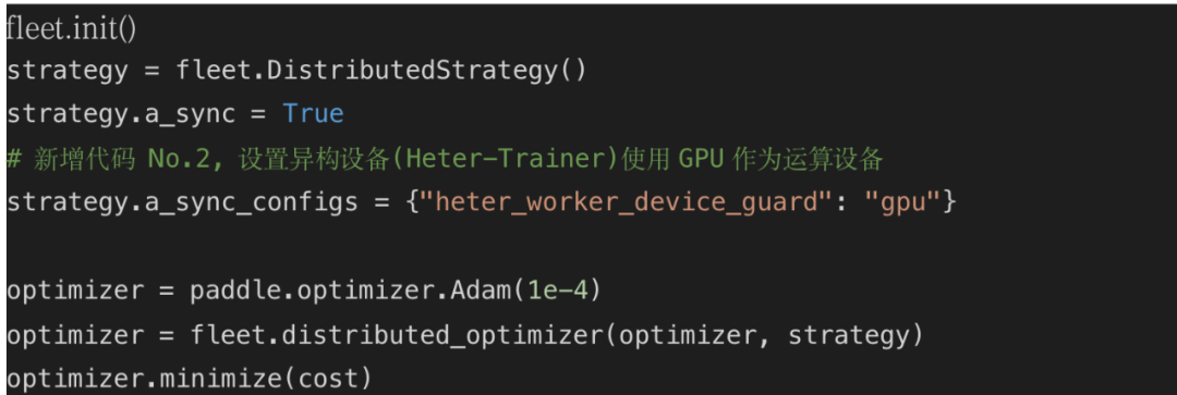 3. 调用 Paddle 分布式 Fleet API,添加运行策略,设置异构设备 (Heter-Trainer) 使用 GPU 作为运算设备,然后完成反向组网。