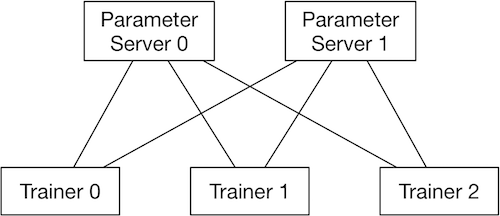 再来看看参数服务器架构。与 Collective 相比,参数服务器架构中除了 Trainer 之外还有一个角色叫 Server。在执行前向与反向计算过程中,Server 负责从各个 Trainer 收集汇总梯度,然后使用这些梯度信息计算更新参数,并向各个 Trainer 分发更新后的参数信息。