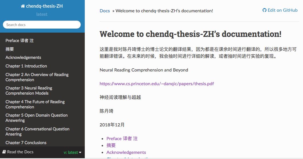 赶紧去看了一下,译者非常用心的将陈丹琦博士论文整理在了readthedocs.io上:
