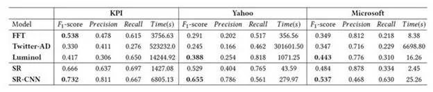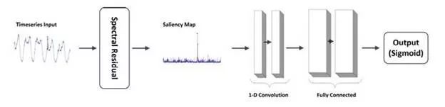 算法示意如图15所示。一个时间序列输入首先经过 Spectral Residual(SR) 模块。SR 是一种基于傅里叶变换的非监督模型,在视觉显著性领域取得了非常好的效果。经过 SR 变换的时间序列被称为 Saliency Map,在此基础之上,我们应用了一个额外的 CNN 网络输出预测结果。我们首次在时间序列异常检测问题中迁移使用了 SR 模型,该方法显著地提升了 SOTA 的精度。同时,我们首次将 SR 与 CNN 相结合,进一步改进了 SR 的性能(评测如表5所示)。在我们的应用中,CNN 可以由完全虚构的数据训练,从而解决了数据标注的问题。