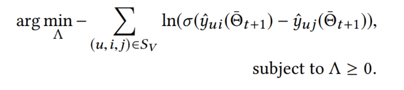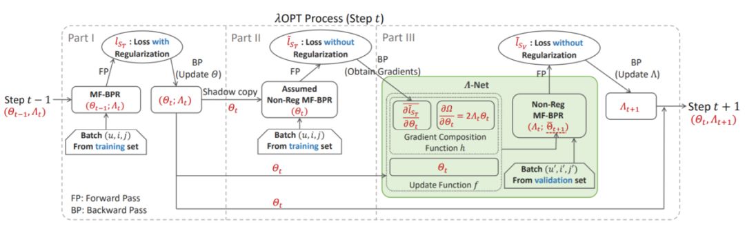 除了正常的模型更新之外,在每一步迭代中,λOpt 基于验证集的表现调整正则化超参:1)在训练集上,预估使用当前超参 Λ 进行一步模型更新后的模型参数 Θ ̅_(t+1)。为了实现更便捷的自适应细粒度正则化,λOpt 以目前流行的自动求导框架为基础,将梯度拆分为未正则化与正则化两部分分别计算;2)在验证集上,求解图12所示约束优化问题。考虑到方法的通用性,λOpt 采用了一个单独的网络 Λ-Net 来更新Λ。