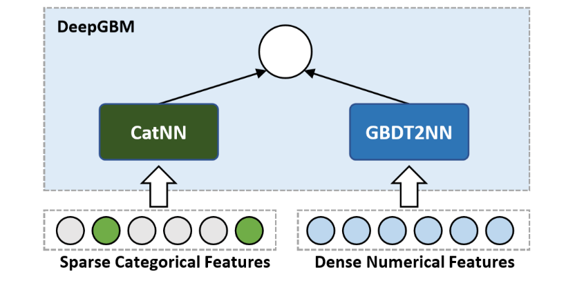 本文提出了 DeepGBM 的端对端模型,结合 GBDT 和 NN 的优势。DeepGBM 主要包含两个子模块——面向类别特征的 CatNN 和面向数值特征的 GBDT2NN。CatNN 主要继承了 NN 中对类别特征友好的 Deep 模块和 FM 模块;GBDT2NN 是文章最主要的贡献之一,其基于 GBDT 进行知识蒸馏构造了一个 NN 模块,可以有效地处理类别特征并可以在线更新。综上,DeepGBM 既支持含有类别特征和数值特征的表格型数据输入,还能利用实时产生的数据进行学习和更新,其基本框架如图1所示: