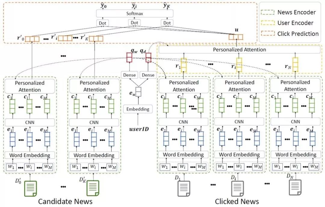 最终候选新闻的点击预估分数通过用户和新闻表示向量之间的内积计算,作为对用户进行个性化新闻推荐时的排序依据。