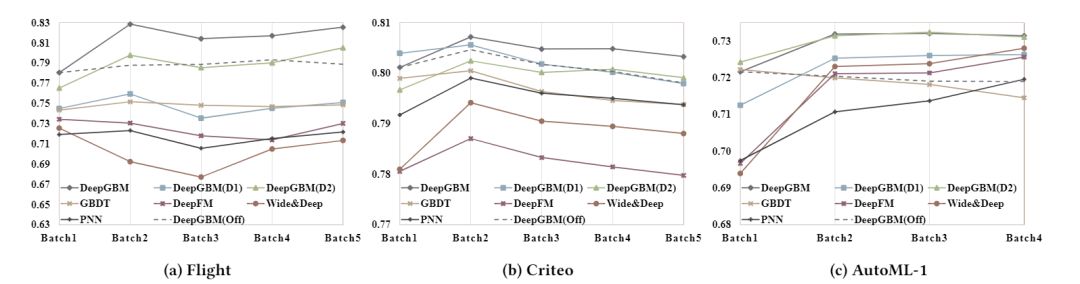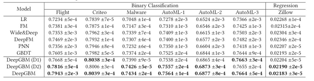 该论文使用了7个数据集来验证 DeepGBM 模型的效果。离线实验和在线实验的结果分别如表2和图4所示。离线实验表明:1)基于 GBDT 的模型较 NN 模型有更好的表现;2)GBDT2NN 在 GBDT 的基础上还有一定提升;3)DeepGBM 的表现比所有的基线模型都要好。在线实验表明:DeepGBM 契合在线场景,且效果比所有的基线模型都要好。