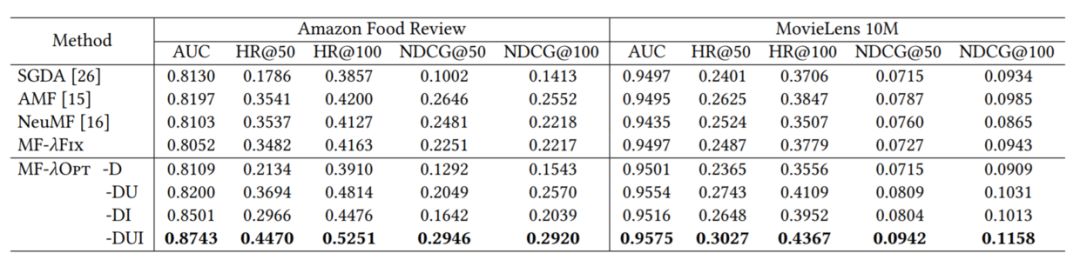 我们在矩阵分解模型上展示了如何使用 λOpt 来进行细粒度超参的选择。在 Amazon Food Review 和 MovieLens 10M 两个数据集上,考虑用户+商品+维度的细粒度正则化后,λOpt 可以同时照顾到不同频率的用户、商品,显著提高推荐性能(如表3所示)。