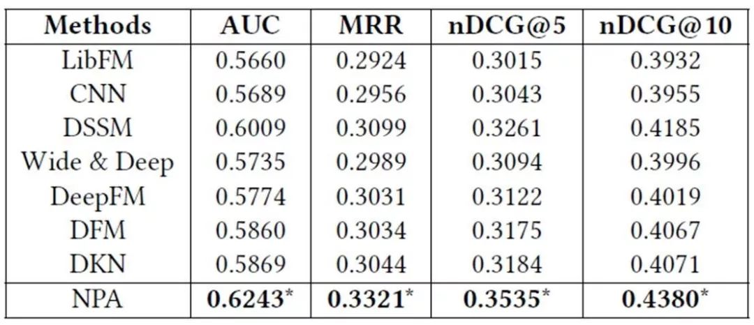 表4:不同模型在微软新闻推荐数据集上的实验结果。*相对基线方法的改进显著水平为 p <0.001。