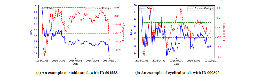 在金融市场的风险决策中,金融特征因子是通过对过去一段时间内市场价格的进行数学运算而形成的,它们往往能反映对应股票的一系列特征,从而对构建金融投资策略起到重要的作用。然而我们发现不同股票对于同一个金融特征因子的亲和度往往是不同的,也就是说即使两个股票拥有相同的金融特征因子的数值,这并不意味着它们此刻的状态是相同的。如图5所示,对于两只不同的股票(ID 601558和ID 000892),即使在特征因子bias-in-30-days上拥有同样的值(例如-0.1),但对两只股票来讲,含义是非常不同的。