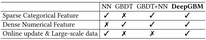 而目前广泛用于这些任务的机器学习模型都没有完美适配这两个重要的特性。常用的机器学习模型大致可分为三类:梯度提升树(GBDT)、神经网络(NN)和二者(GBDT+NN)结合的模型。其中 GBDT 可以很好地处理连续的数值特征,但很难处理好稀疏的类别特征,并且 GBDT 是利用全量数据学习的,很难高效地进行在线更新;而 NN(如Wide&Deep、DeepFM等)虽然可以用 embedding 技术处理好稀疏类别特征,且可以高效地在线更新,但其难以很好地处理数值特征;常见的 GBDT+NN 方法会单独使用 GBDT 再使用 NN,但同样由于 GBDT 的缘故,难以在线更新。综上,其特点对比如表1所示: