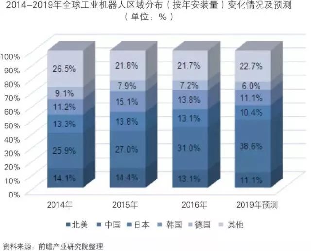 从全球工业机器人的年安装量变化情况来看,据IFR的统计,2016年中国安装量占比提升至31.0%,北美、日本、韩国和德国的安装量比重略有下滑。整体来看,2016年亚太地区依然是工业机器人安装量增量最大的市场。据IFR的预测,到2019年,中国安装量比重将进一步上升至38.6%。