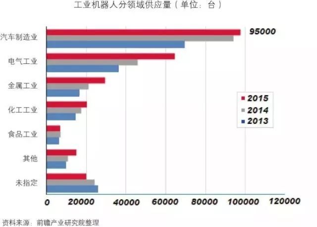 从下游应用结构领域来看,工业机器人传统应用领域是汽车行业,2015年汽车行业工业机器人需求量达到9.5万台,约占总需求量的38.8%,仍为下游最大的应用领域。但是从增速来看,非汽车领域(电子、金属、橡胶和塑料等)是主要增速较快的几个领域。国内市场而言,继汽车以后,3C、家电等领域有望接棒汽车行业需求。