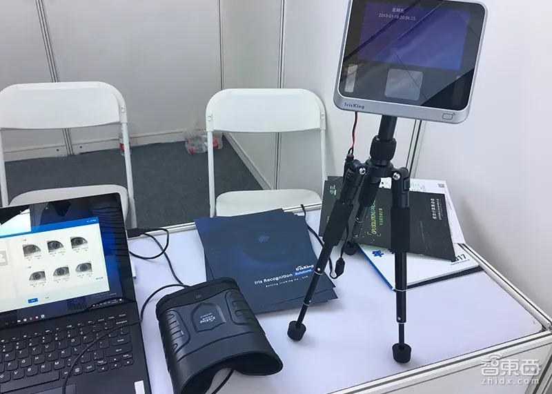 做虹膜识别业务的中科虹霸和中科虹星则是一对同门兄弟,他们的创始人员都源自中科院自动化所的虹膜识别研究团队。不过,两家公司的主攻方向却有所不同。中科虹霸主要在做近距离虹膜识别的产品,展位工作人员向智东西展示了他们的可以存放20000人虹膜信息的身份验证成机,用户在距离机器大致60cm的位置录入虹膜,随后即可通过虹膜识别判断身份。