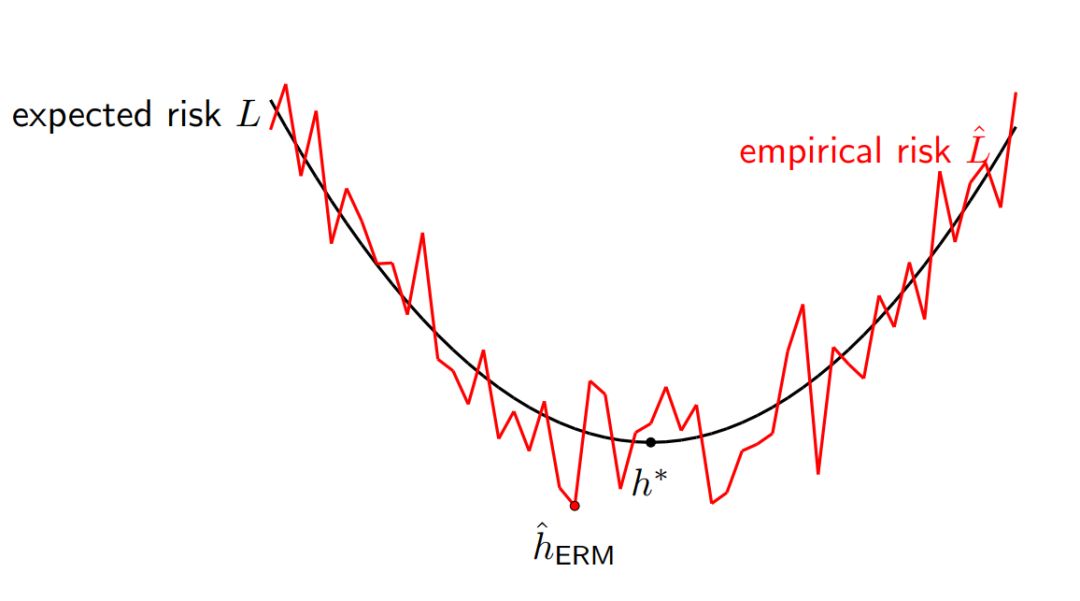图 2:我们希望最小化期望风险 L 以获得最优的 h*,但是我们实际上只能最小化经验风险 L ^以获得 h^。