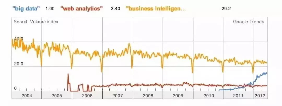 用Google搜索了一下“Big Data”,得到了19,600,000个结果……而使用同样的词语,在两年前你几乎搜索不到什么内容,而现在大数据的内容被大肆宣传,内容多得让人眼花缭乱。而这些内容主要是来自IBM、麦肯锡和O’Reilly ,大多数文章都是基于营销目的的夸夸其谈,对真实的情况并不了解,有些观点甚至是完全错误的。我问自己…… 大数据之于数据分析师,它意味着什么呢?如下图所示,谷歌趋势显示,与“网站分析”(web analytics)和”商业智能”(business intelligence)较为平稳的搜索曲线相比,“大数据”(big data)的搜索量迎来了火箭式的大幅度增长。