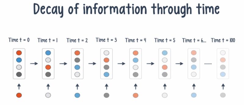 RNN不是完美的。它有一个重大缺陷,称为梯度消失问题,阻止它取得高精确度。随着上下文长度的增加,展开的RNN中的网络层也增加了。因此,随着网络的加深,反向传播中由后往前传播的梯度变得越来越小。学习率变得很低,期望这样的模型学习到语言的长期依赖不太现实。换句话说,RNN在记忆序列中很久之前出现的单词上遇到了困难,只能基于最近的一些单词做出预测。