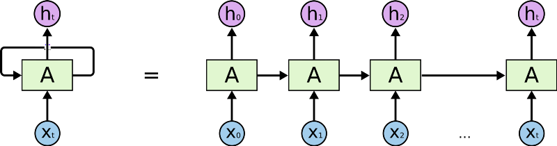 这一循环结构让神经网络可以接受输入序列。下面的展开图有助于你更好地理解RNN: