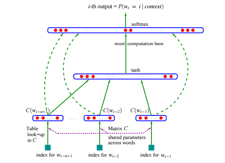 不同于n元语法方法,我们可以尝试基于窗口的神经语言模型,例如前馈神经概率语言模型和循环神经网络语言模型。这一方法将单词表示为向量(词嵌入),将词嵌入作为神经语言模型的输入,从而解决了数据稀疏问题。参数在训练过程中学习。词嵌入通过神经语言模型得到,语义相近的单词在嵌入向量空间中更靠近。此外,循环神经语言模型也能捕捉句子层面、语料库层面、单词内部的上下文信息。