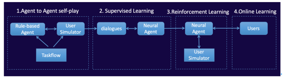 对话管理模型设计四步骤:智能体到智能体的 self-play、监督学习、强化学习和在线学习。