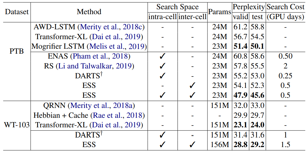 语言模型任务(PTB 和 WikiText-103)上 ESS 方法搜索得到的结构同其他结构的性能对比。