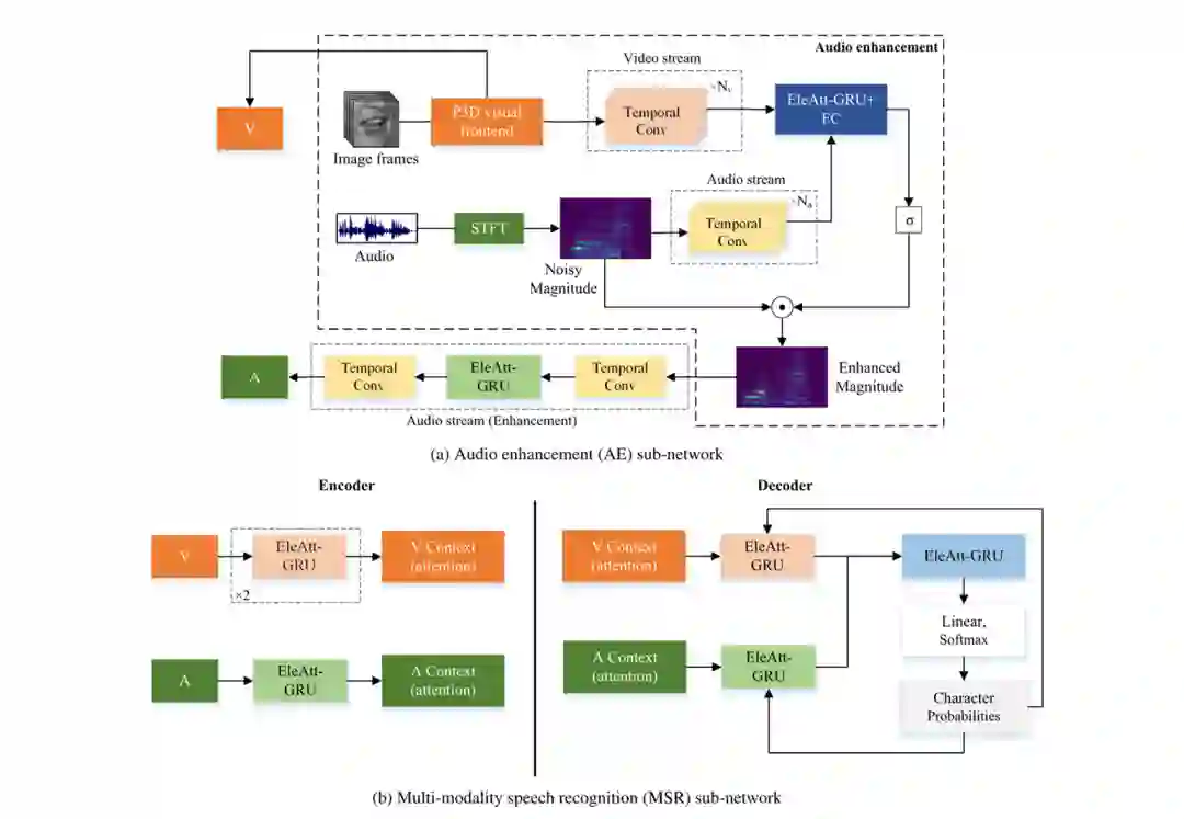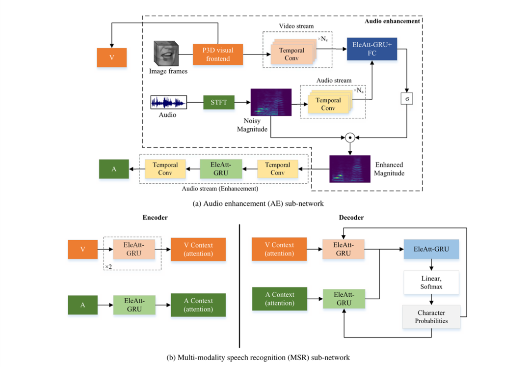 本研究中具有双重视觉意识(AE-MSR)的多模态语音识别网络架构图,其中 AE-MSR 网络包含两个子网络:(a)音频增强子网络;(b)多模态语音识别子网络。