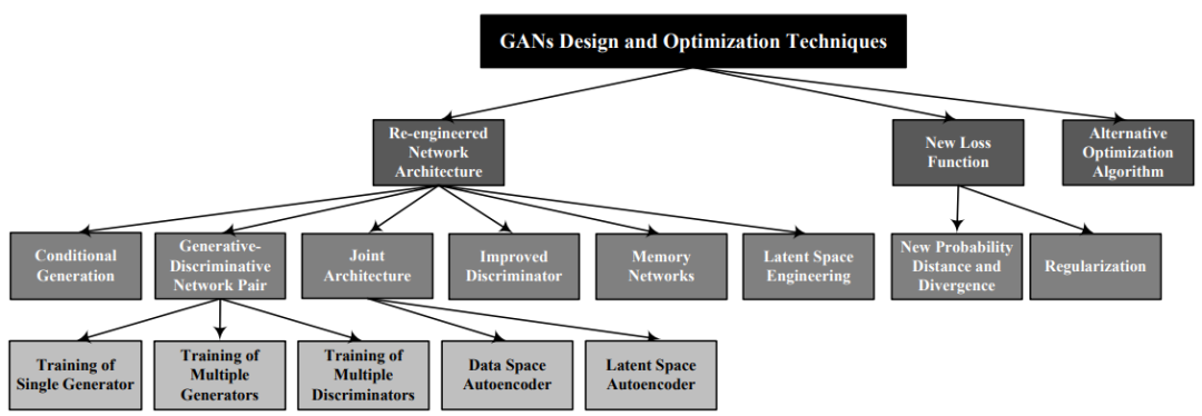 。他们首先指出每个 GAN 设计和优化方法存在的主要研究问题,然后提出新的分类法对相应解决方案进行结构化整理。基于这种新的分类法,研究者对每个解决方案提出的不同 GAN 变体以及它们之间的关系展开了详尽的讨论。最后,研究者根据得出的见解提出了这一快速发展领域中的有前途研究方向。