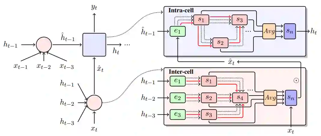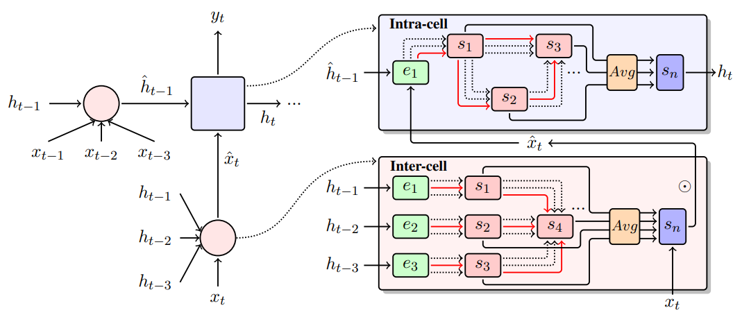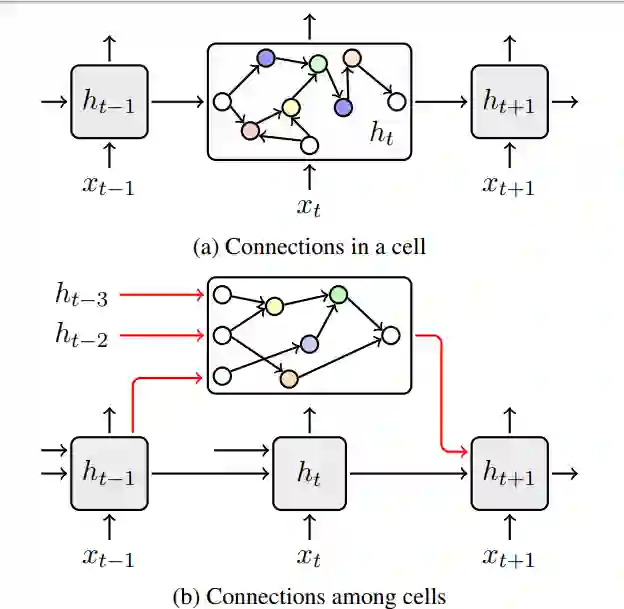 循环神经网络中元结构内部以及元结构之间结构搜索示意。