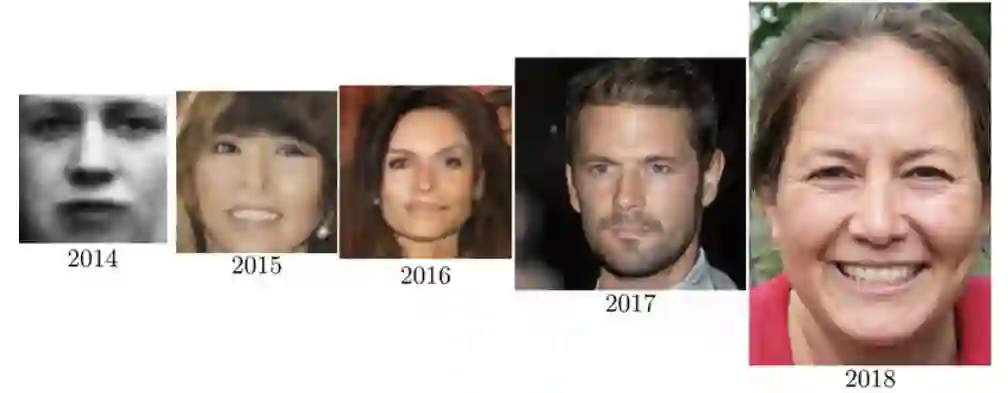 2014 至 2018 年,GAN 在图像生成领域展现出来的能力取得了长足进步。