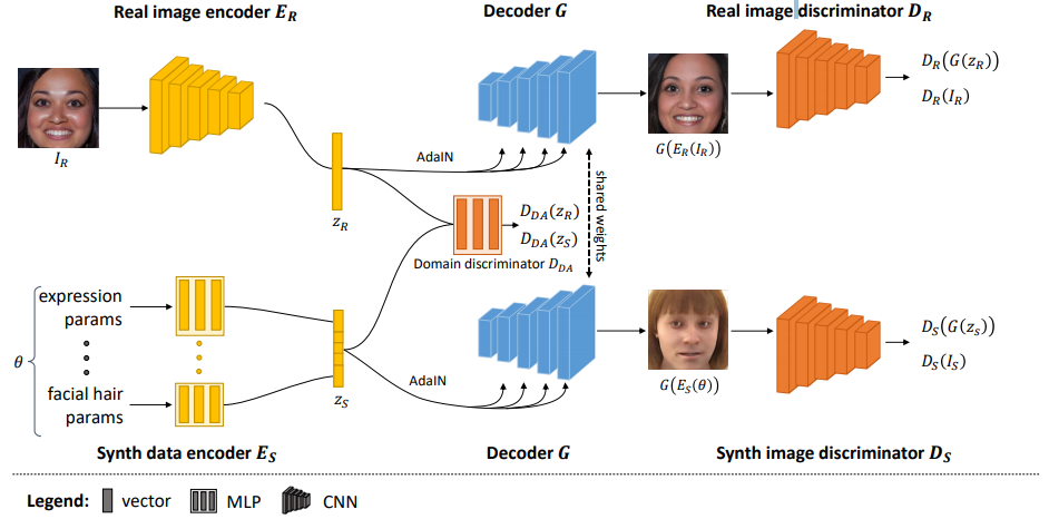 ConfigNet 具有真实图像编码器 E_R 和合成数据编码器 E_S,它们对真实人脸图像 I_R 和合成人脸图像 I_S 的参数θ进行编码。