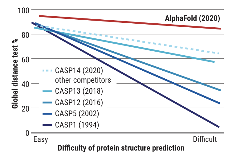 蛋白质对于生命至关重要,它们是由氨基酸链组成的大型复杂分子,其作用取决于自身独特的 3D 结构。弄清蛋白质折叠成何种形状被称为「蛋白质折叠问题」。在过去 50 年里,蛋白质折叠一直是生物学领域的重大挑战。 DeepMind 的 AlphaFold 让人类在这一问题上取得了重要突破。在今年的国际蛋白质结构预测竞赛 CASP 中,DeepMind 开发的 AlphaFold 最新版本击败了其他选手,在准确性方面比肩人类实验结果,被认为是蛋白质折叠问题的解决方案。这一突破证明了 AI 对于科学发现,尤其是基础科学研究的影响。